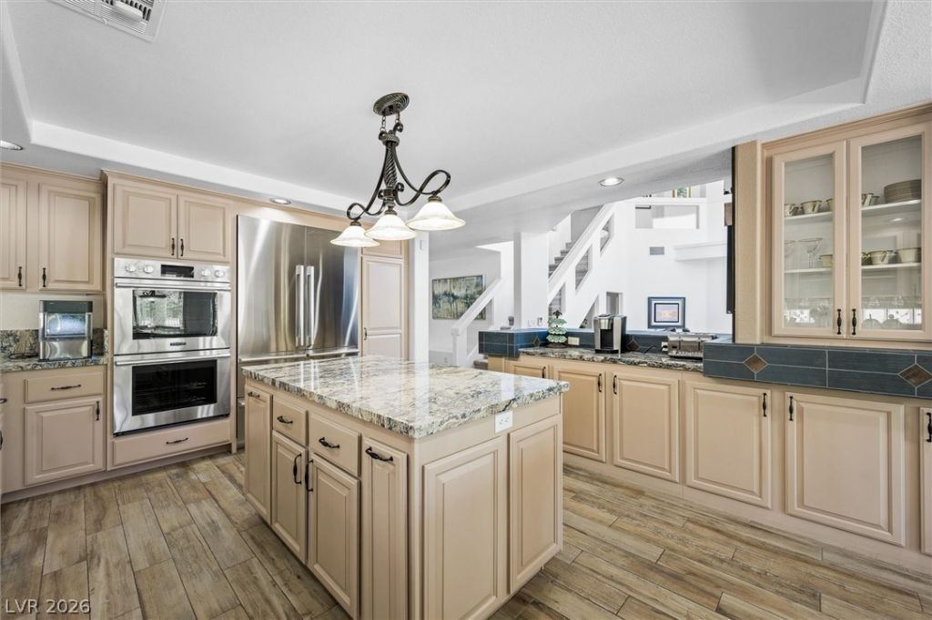 Located in the guard-gated Royal Highlands community of Southern Highlands, this home backs to a greenbelt & walking path, offering added privacy & an open backyard setting. The main level features tile flooring throughout, high ceilings, and natural light. The kitchen includes granite countertops, a large island, and ample cabinetry, opening to the main living areas. The primary suite is on the main floor with direct backyard access, and bathrooms have been updated with newer vanities and fixtures. Upstairs offers a loft, fresh carpeting, and generously sized secondary bedrooms with larger closets. A full basement provides flexible space for a media room, office, or extended living. The backyard is designed for everyday use and entertaining, featuring a pool & spa, water features, sealed pavers, & a custom outdoor kitchen with built-in barbecue, pizza oven, & fire feature, all along the greenbelt. Additional features include a 3-car garage, updated water heater, & newer HVAC systems.