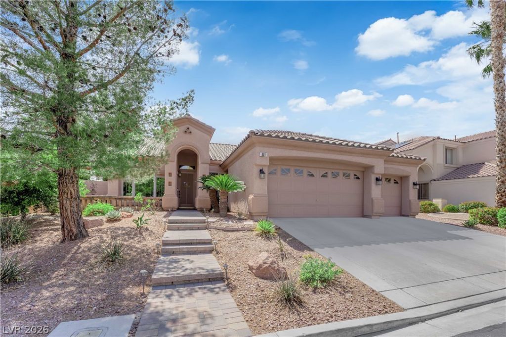 Very hard-to-find single-story home in Summerlin with a 3-car garage, located in the gated community of Quail Ridge. This beautifully maintained property features new flooring and updated plumbing, along with 20 tile floors, granite countertops, custom cabinetry, select stainless steel appliances, and a kitchen sink. Enjoy ceiling fans throughout, plantation shutters, and a covered patio with shades?perfect for relaxing or entertaining. Zoned for top rated schools. The home also boasts upgraded landscaping in both the front and rear with LED lighting that truly shines at night. A versatile den/office can easily serve as a 4th bedroom. Additional highlights include a water softener, epoxy garage floors, and a newer HVAC system installed in 2015. The spacious primary suite offers a fully remodeled walk-in shower, a large bedroom, and a walk-in closet.